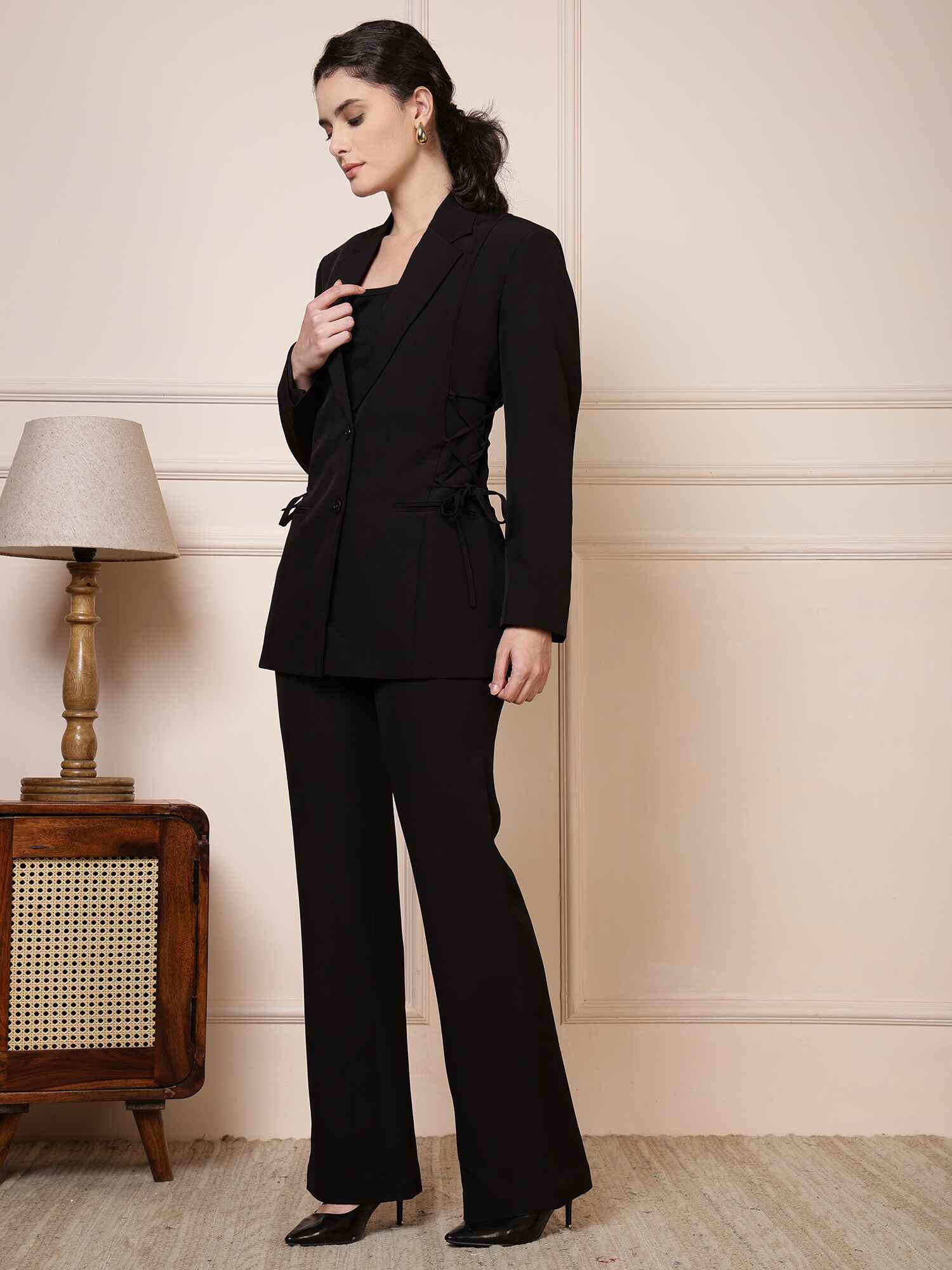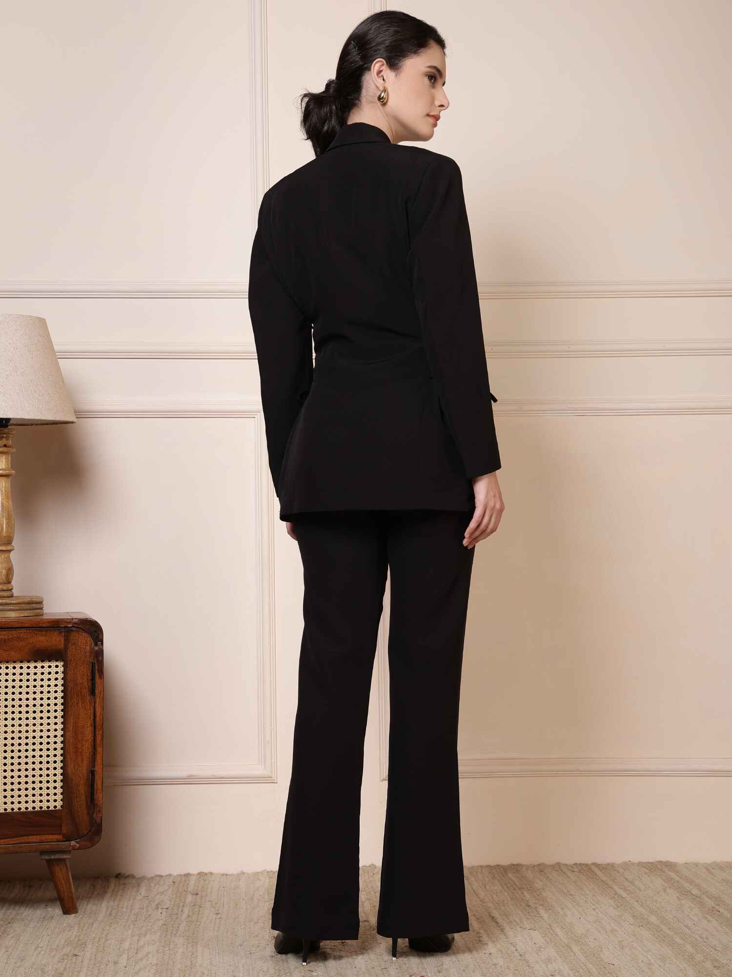 Timeless black suit set featuring a tailored blazer with side ties and straight-cut trousers — a modern take on classic power dressing.